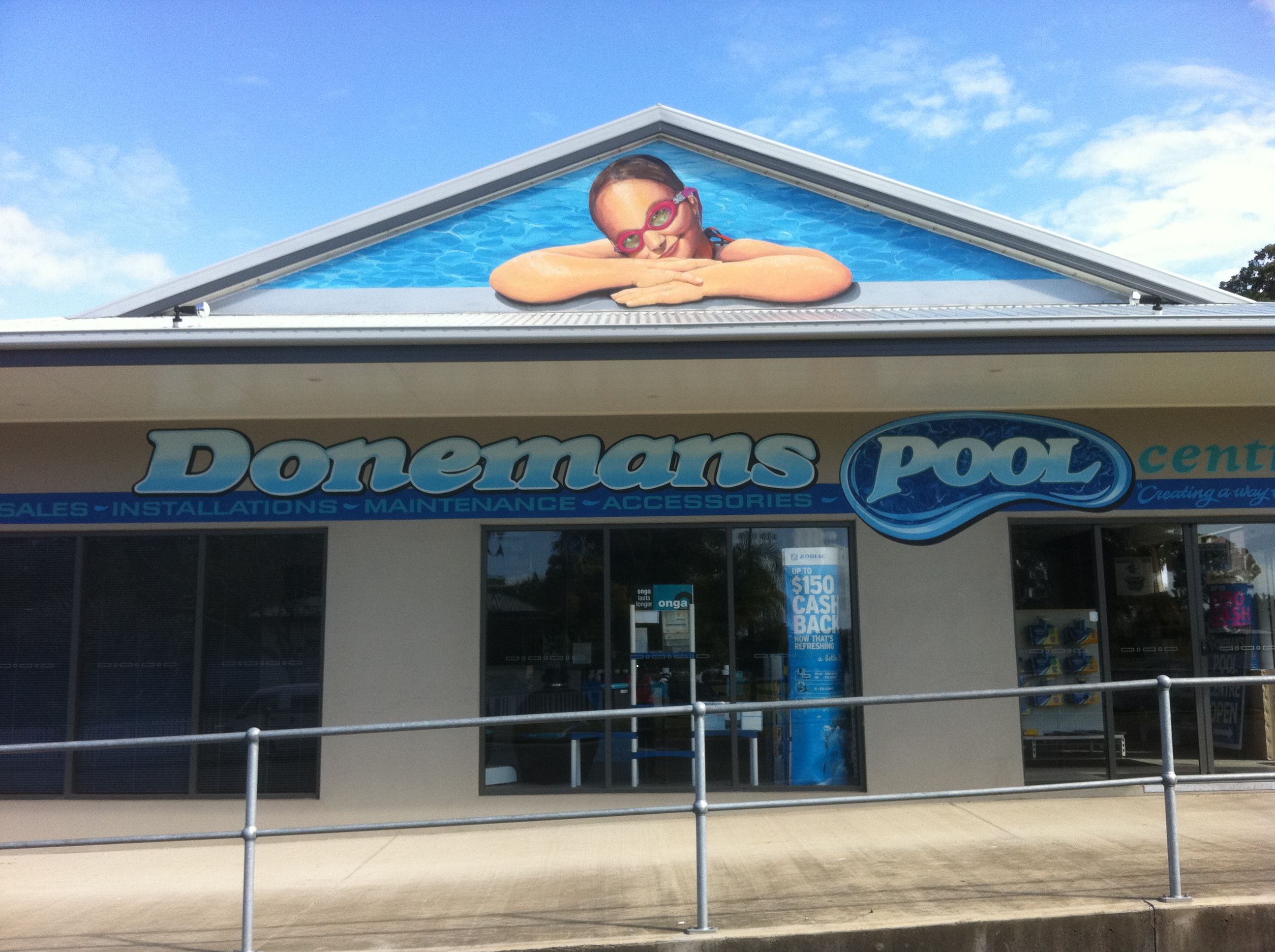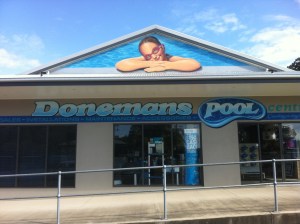 IMG_0651 June 26, 2013 / Rob The art of the young swimmer was hand painted onto Vynil canvas and installed onto the building gable front. All the rest of the work was hand painted on site.